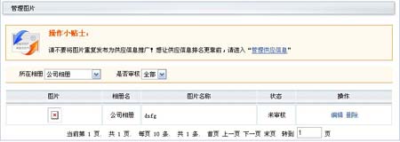 首先恭喜您成為我們的會(huì)員,您將會(huì)享受到我們對(duì)會(huì)員的優(yōu)質(zhì)服務(wù)。請(qǐng)確認(rèn)您是否登錄,如果沒(méi),請(qǐng)先登錄。如果您已經(jīng)成功登錄進(jìn)入到了旺鋪后臺(tái),請(qǐng)您找一下左邊導(dǎo)航中的公司相冊(cè)欄目下的管理圖片子欄目。點(diǎn)擊此導(dǎo)航,您就會(huì)看到發(fā)布的公司圖片的列表(如下圖)。 |