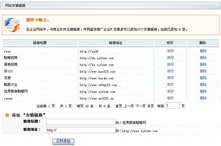 如果您還沒(méi)有登錄,請(qǐng)先登錄。如果您登錄成功進(jìn)入旺鋪后臺(tái),請(qǐng)您點(diǎn)開(kāi)左邊導(dǎo)航中的網(wǎng)站友情連接,點(diǎn)擊后,您就會(huì)對(duì)連接進(jìn)行查看和操作了(如下圖)。 |